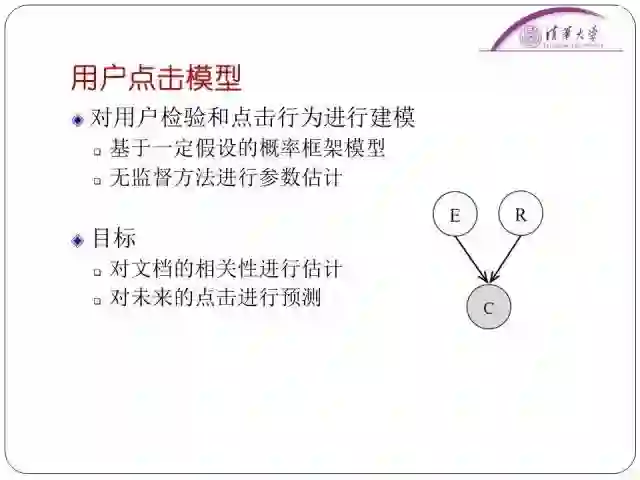 但是实际上大多数用户想找的肯定是最新的会议上的消息。但是搜索点击模型的目的是对文档的相关性进行估计以及对于用户的点击进行预测。那么上面的这些因素都会影响用户点击模型的分析。我们要做的是消除这种影响,帮助搜索引擎更好地排序。这件事情比较复杂,因为每个用户的点击情况都不太一样,所以我们需要引入一些假设把这个问题说清楚。