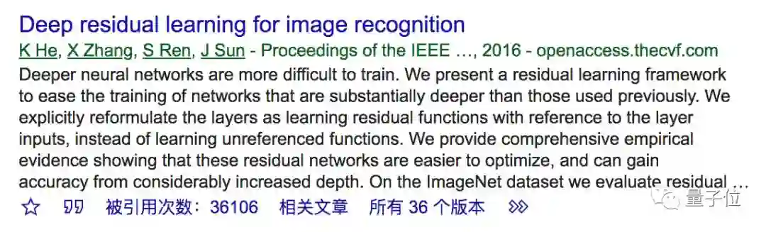另外,CVPR 2016最佳论文Deep Residual Learning for Image Recognition,引用次数也超过了36000。