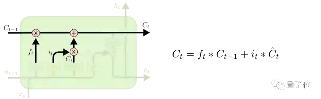 把旧状态与ft相乘,丢弃掉确定需要丢弃的信息,再加上经过筛选后的新信息,就得到了当前cell的状态。