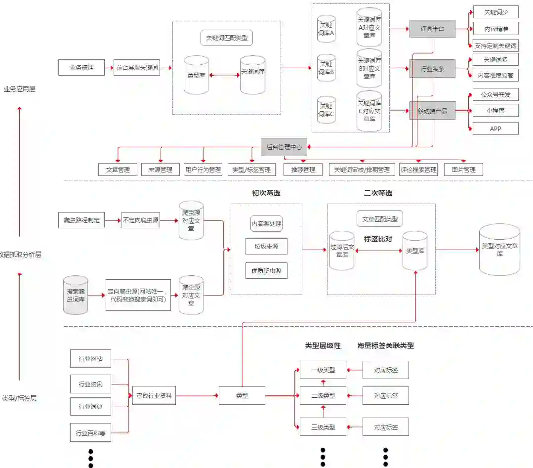 我开始从三个层面去搭建产品,底层类型标签层,中层数据抓取分析层,顶层业务应用层。
