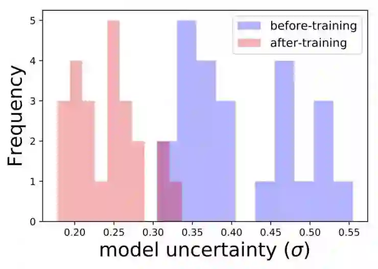 另一个很酷的例子就是标题特征:带有罕见词汇的独特标题应该会带来很高的模型不确定性。这是由于模型缺乏相关学习经验的结果。我们可以从验证集中找出那些含有罕见词汇的标题,并估计模型在这些标题上的不确定性。然后我们将使用其中一个标题重新训练模型,再观察模型在这些标题上的不确定性是否有所降低。从下面图表中我们能够获得更好的了解。