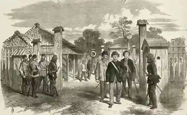 明治维新时期,穿西装的日本人穿过欧洲军队把守的横滨市入口大门