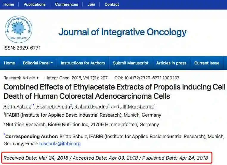 《综合肿瘤学杂志》(Journal of Integrative Oncology)上的一篇文章指出,一项临床研究表明,蜂胶提取物在治疗结直肠癌方面比化疗更加有效。实际上这项研究是假的,作者也隶属于一个根本不存在的研究中心。
