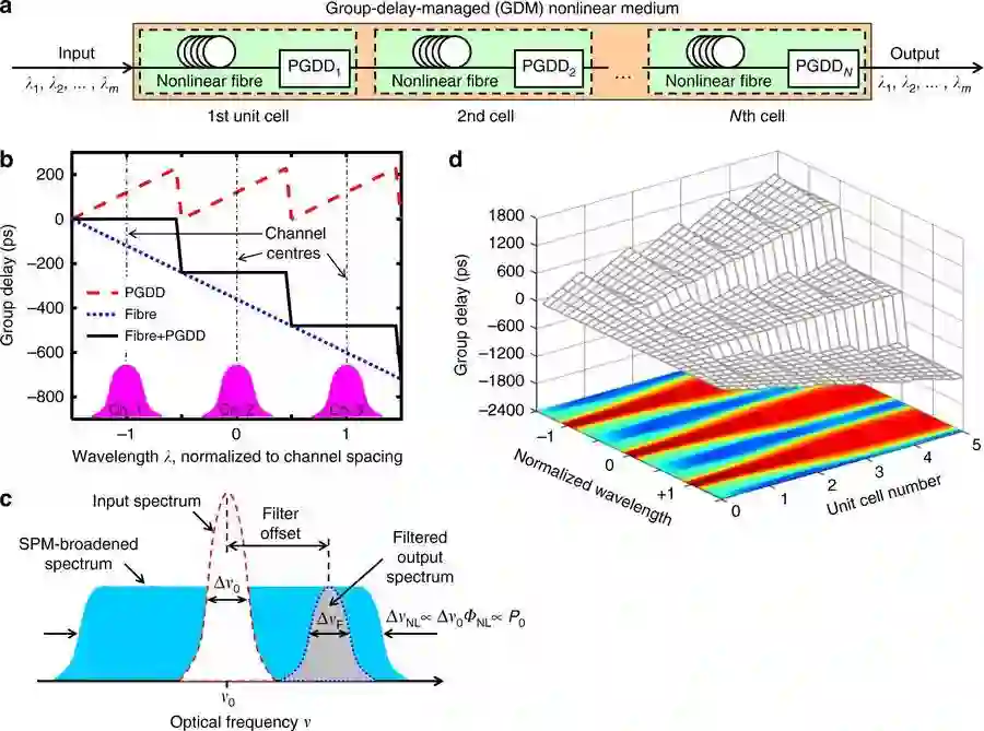 在他们发表的论文中,Vasilyev 及其同事们通过实验演示,报告了一种新型“群延迟管理的非线性光学介质”。在这种介质中,实现强烈的SPM效应不会带来信道间的干扰。将传统的非线性媒介,例如光纤,拆分为几个短部件。这些部件由特殊的周期性群延时过滤器分开,这些过滤器产生一种介质,在这种介质中,同样的WDM信道的所有频率部件的光线传输速度相同,从而保证了强烈的SPM。不同的WDM信道中,光线以不同的速度传播,这样明显地抑制了信道间的交互。