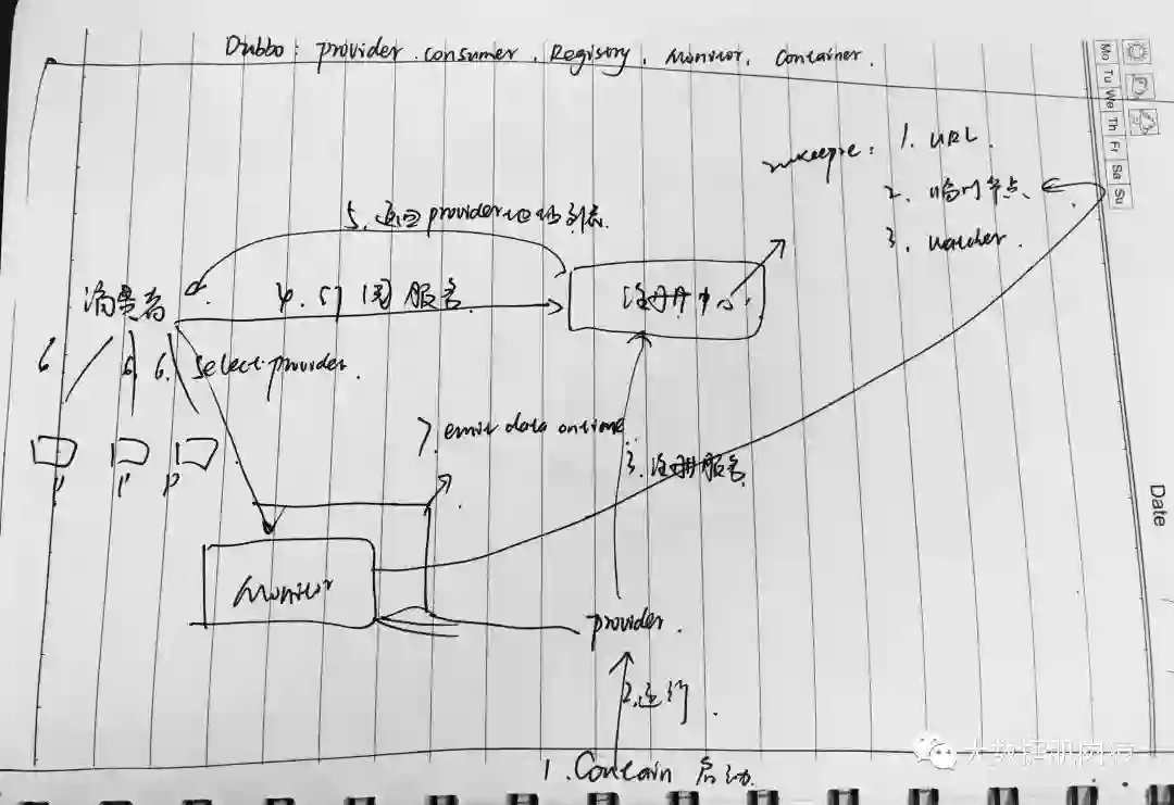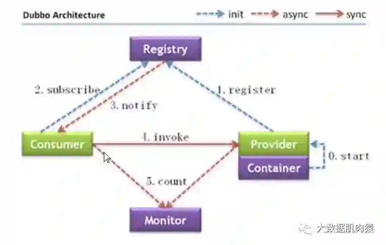 他们之间调用的关系是:Container负责启动,加载然后运行Provider。Provider在启动时会向注册中心注册自己提供的服务,Consumer在启动时会向Registry订阅自己所需服务,此时Registry会返回Provider地址列表给Consumer。如果地址有变更,Registry会基于长连接推送变更数据给Consumer。Consumer会基于软负载均衡算法选一台提供者进行调用,如果调用失败,则再选一台。Provider和Consumer在内存中累计调用次数和调用时间,定时每分钟发送一次统计数据到Monitor。