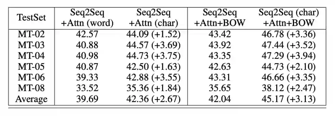本部分评测使用中英翻译,使用语料为从 LDC 语料中抽取的125万个句子对。验证数据使用的是NIST 2002 ,测试数据使用的是NIST 2003,2004,2005,2006和2008。实验使用了出现频次最高的前30,000个英语词语,以及前27,500个中文词语。char model 的词语量设置为4500。作者对中译英和英译中两种任务都进行了评测,表4所示中译英结果,表5表示英译中结果。