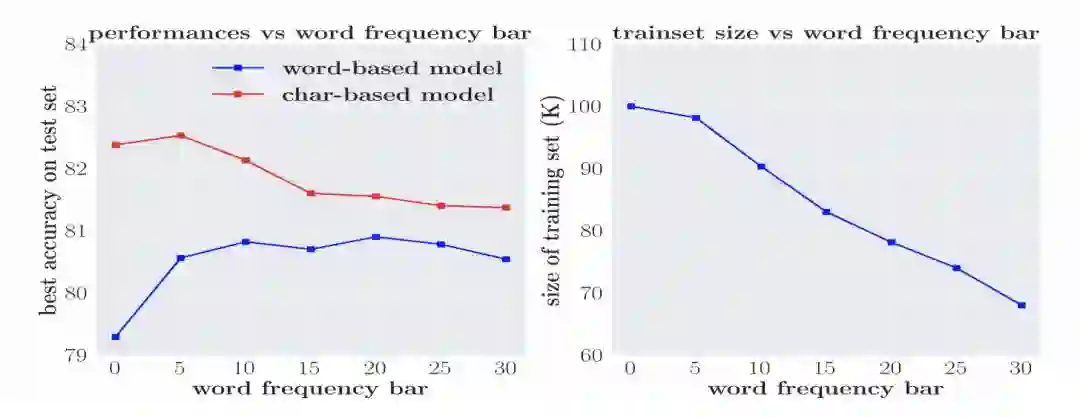 在这一部分,作者探究了 char model 效果优于 word model 的原因,尽管未能完全指出基于词语的模型的运行机制,但作者尝试分析了几个主要的影响因素。