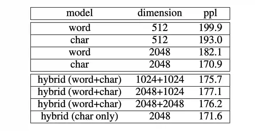 实验中,对比了不同维度下,单独的 word、char 模型和混合模型的效果。可以发现,char 模型的效果都优于 word 模型,维度为 2048 时,ppl 达到最优的结果差距明显 。作者在标准 CWS 包和 LTP 包也进行了实验,并获得了相同的结果。