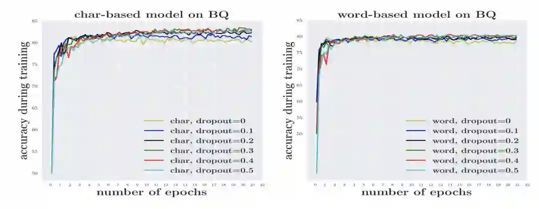 数据稀疏导致模型需要学习的参数增加,使得模型更加容易过拟合。本文在 BQ 数据集上进行了实验,结果如图1所示。要获得与基于词语的模型相似的效果,基于词语的模型需要设置更高的 dropout 值。
