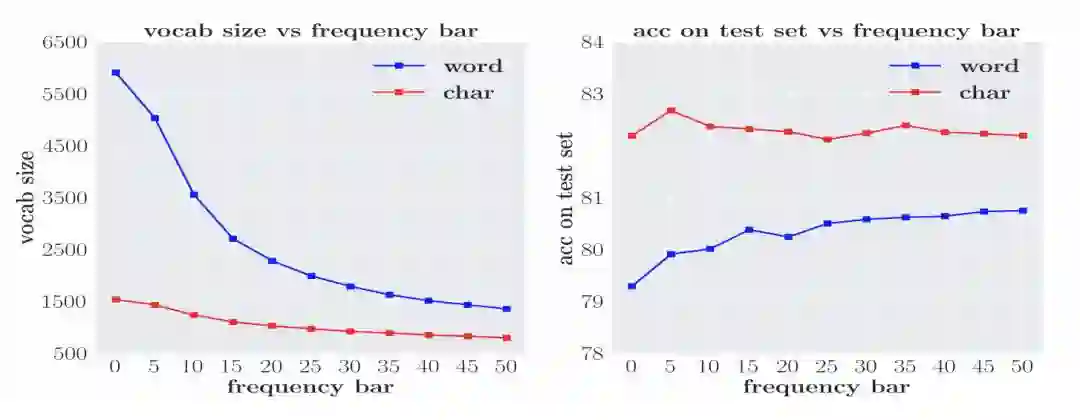 这篇文章在分析分词不 work 的时候,很大一部分把不 work 的原因归因于 oov 太多,我个人不认同,至少分类动不动就能开十万+ 级别的词表,一方面 oov 不会太多,另一方面即使 oov 太多,也应该分析一下哪些 oov 导致模型不 work 吧,其实我个人认为根本不是 oov 的原因造成的。要不然英文里面的 word 也不会 work 了。