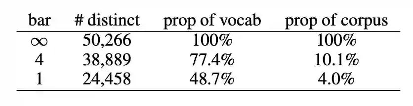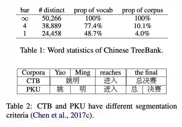 首先,data sparsity 会导致模型出现过拟合,OOV 则会限制模型的学习能力。根据齐普夫定律(Zipf’s law),很多中文词的出现频率都非常低,这使得模型难以学习到词语的语义信息。以使用较为广泛的 Chinese Treebank 数据集(Chinese Treebank dataset, CTB)为例进行说明。通过使用结巴分词对 CTB 数据集进行切词,可以得到615,194个词语,其中不同词语50,266个。这些词语中,有24,458个词仅出现一次,占总词数的48.7%,仅占语料的4%。表1展示了针对这一语料的统计数据,可以看出基于词语的数据集非常稀疏。由于词语数的增加会使模型参数增多,数据稀疏很容易引起过拟合问题。另外,由于维护大规模的词语-向量表存在难度,很多词语都会被处理为OOV,进一步限制了模型的学习能力。