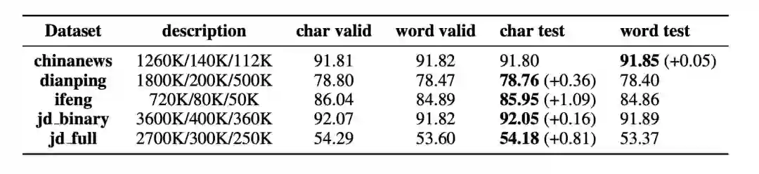 文本分类任务中使用的评测基线包括 ChinaNews, Ifeng, JD_Full, JD _binary, Dianping。作者使用双向 LSTM 模型对基于word 和基于char 的模型分别进行训练用于评测,评测结果如表7所示。除 ChinaNews语料库外,基于字符的模型的表现均优于基于词语的模型。