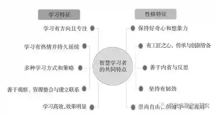 从性格特征来看,好奇心和想象力带来的是对问题的质疑与探究,学习的主动和积极;工匠之心意味着专注、精益求精的态度,既吸收传统的精华又善于创造新的成果;内省与反思则是随时思考自己的言语、行为表现等是否符合道德或者创造的规律,通过元认知审视活动,随时不断完善想法和改善行动;坚持的态度对要做成任何事情都是需要的;对智慧学习者来说,有独立的思想和遵守一定的规则不是矛盾的,规则是自由的前提。