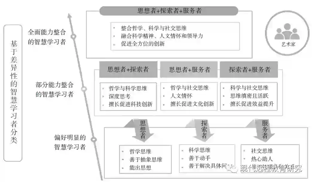 这样分类的意义在于尊重每个学习者思维的独特性和能力的差异性。从一方面讲,正是由于每一个学习者的发展潜质、擅长思考和做贡献的领域不同,我们才有机会拥有如此丰富多彩的世界。从另一个方面讲,无论我们如何期盼每个人都是聪明睿智的,这都是不可能的。全面能力整合的智慧学习者还是比较罕见的(如达芬奇、乔布斯等),大多数可能都是部分能力整合或偏好明显的学习者,所以擅长学习不同领域的知识和技能,参与不同领域产品、机制与社会关系的创造、创新。因此学校教育需要为每个人的个性发展创造条件。当前许多学校的数字化校园建设项目也都在尝试通过网络化、智能化、全球化的智慧学习环境为学生的个性化学习提供机会。
