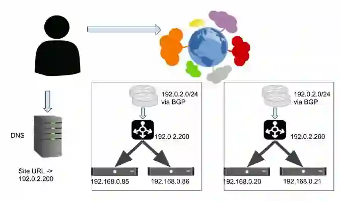 两个站点的边缘路由器都把自己的地址空间宣告出去,包括 VIP 地址。发往该 VIP 的请求可能到达任何一个站点,取决于用户和系统之间的网络是如何连接的,以及各个网络的路由策略是如何配置的。这就是泛播。大部分时候这种机制可以很好的工作。如果一个站点出问题了,你可以停止通过 BGP 宣告 VIP 地址,客户的请求就会迅速地转移到另外一个站点去。