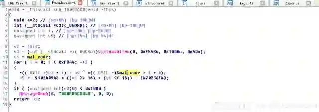进一步分析这几个函数,主要功能是申请内存,解密一段”特殊代码”(暂定为mal_code),然后再执行该代码,这种行为通常是后门用来执行shellcode。
