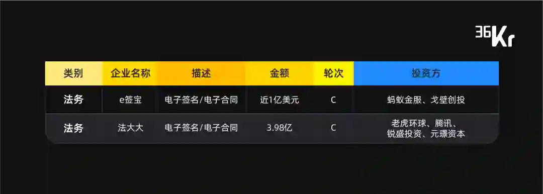 通用型大数据项目已经发展到非常后期的阶段。去年极光大数据成功登录纳斯达克成为大数据服务第一股。今年披露的大数据项目交易金额非常惊人,明略数据 D 轮融资金额达 20 亿人民币,数梦工场 B 轮 6 亿,星环科技则完成数亿 D1 和 5 亿 D2 轮融资。BI 方面,竞争格局越来越明朗,思迈特软件和观远数据完成 B 轮融资,中后期项目还有帆软软件、海致 BDP、海云数据和永洪科技。5. 法务:电子签名与合同管理