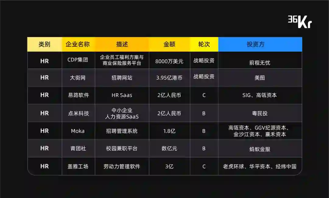 个税改革是推动今年 HR 市场增长的一个重要变量。最直接的影响就是改变企业用工结构,灵活用工薪税管理成为今年早期项目的热点。不仅有大量新项目出现,已经发展到中后期的社保类企业、传统劳务派遣类企业、兼职/灵活用工招聘平台,也纷纷将其作为新的业务增长点。不过,灵活用工管理与薪税筹划服务同质化高,难以建立竞争壁垒,存在政策风险。虽然业务发展如火如荼,但机构落子谨慎。从大额融资来看,资金流向了中低层岗位的招聘与人员管理。如果将招聘岗位高低分为三层,猎头市场极其非标,中高端白领市场已经有猎聘网、BOSS 直聘、拉钩网、前程无忧、智联招聘等企业,剩下蓝领市场尚可群雄逐鹿。除了 58 孵化的斗米兼职、获得蚂蚁金服投资的青团社、BOSS 直聘孵化的店长直聘,美团在今年 3 月也悄悄上线了蓝领招聘产品馒头直聘。除了招聘,劳动力管理工具也是撬动蓝领市场的一大方向,并且相对劳务外包重运营的模式而言,管理工具是风投更喜闻乐见的“轻资产模式”,去年下半年安心记加班、喔趣均披露了 B 轮融资,今年盖雅工场先行披露了 C 轮融资。3. 财税:电子发票