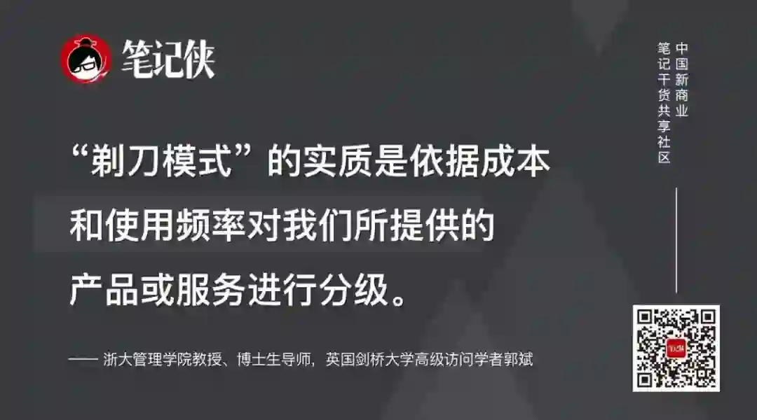 将高价元素以低于成本的方式去销售,于是开创了后面我们称之为“剃刀模式”,它的实质是依据成本和使用频率对我们所提供的产品或服务进行分级。
