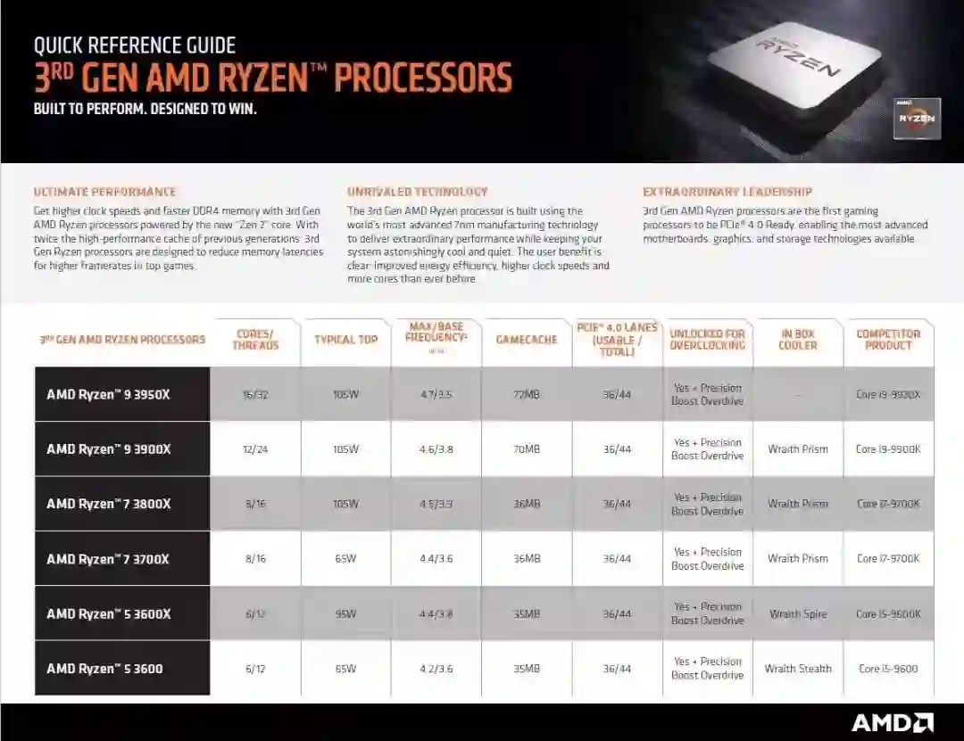 2019 年下半年,AMD 正式推出了首款面向消费者的 7nm 制程主流与高端台式机处理器三代 Ryzen 和 Ryzen Threadripper。截至目前,共有六款 Ryzen 处理器已正式开售,另有两款 Ryzen Threadripper 处理器最近已进入 HEDT 市场。以下是 AMD 2019 年三代 Ryzen 产品阵容(不包括 Ryzen 5 3400G 和 Ryzen 3 3200G):