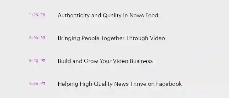 今年有四个主题演讲以「视频和新闻」为主题,其中谈到的内容包含视频和新闻在 Facebook 产品中扮演的角色,以及视频和新闻在未来的商业化路径。