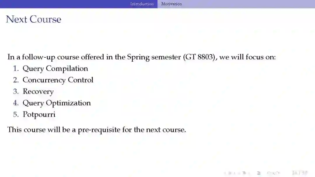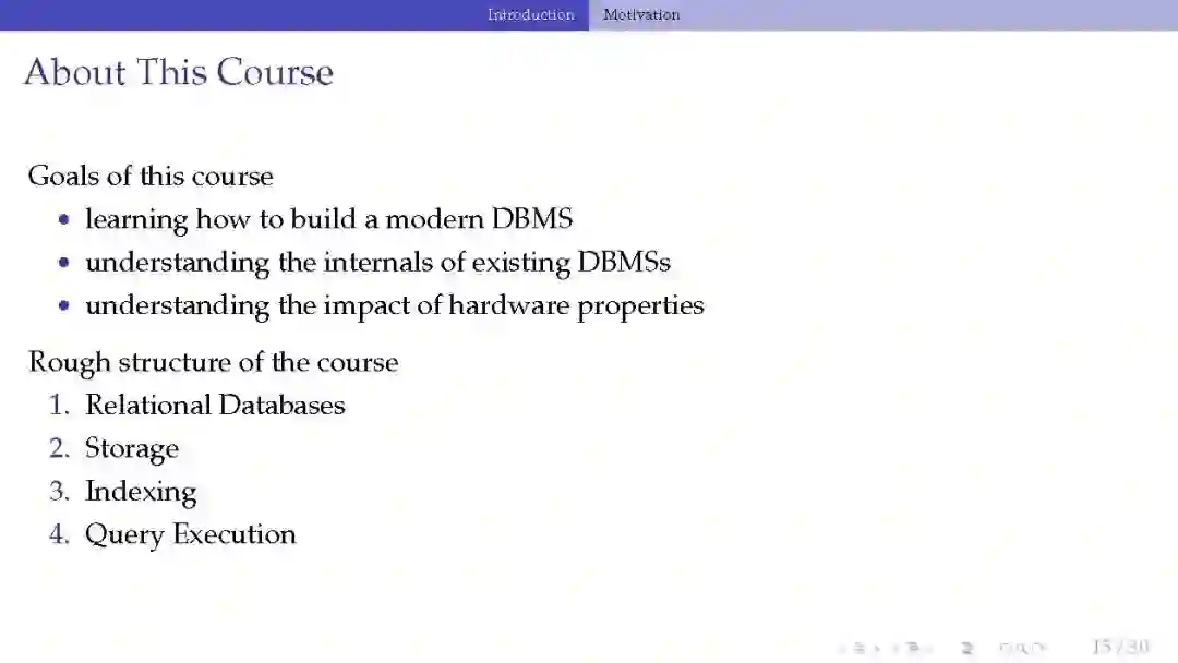 本课程是讲座和编程作业的结合,其中我们将学习现代数据库管理系统的内部原理。它将涵盖在高性能事务处理系统(OLTP)和大型分析系统(OLAP)中使用的组件的核心概念和基础。这个类将强调这些思想实现的效率和正确性。本课程适用于对系统编程感兴趣的高级本科生和研究生。
