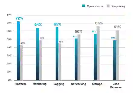 Kubernetes 也从整体上增加了大家对开源软件的信心。相比闭源软件,受访者更喜欢用开源平台,对于日志和监控也更倾向于使用开源解决方案。而对于负载均衡、存储等解决方案,受访者则更喜欢用闭源方案。