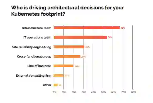 谁在驱动 Kubernetes 的架构决策?受访者的回答有很多,包括架构团队,IT 运维团队,SRE,多功能团队,业务线,外部咨询公司等。在很多组织内部,不知道该由谁来承担对 Kubernetes 的责任。也难怪前面提到的内部团队对通用技术的统一认识是一大痛点。