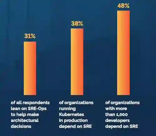 调查结果显示,采用 SRE-Ops 做决策的团队占31%,在生产环境中使用 Kubernetes 时采用了 SRE 的团队占38%,有 1000+ 开发者,并且采用 SRE 的团队占48%。