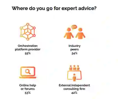 团队寻求建议的信息源差不多,主要包括编排工具供应商(55%),独立咨询公司(42%),业内同行(54%)和相关论坛(53%)。仅有 4% 的受访者在部署 Kubernetes 的时候不需要帮助。这个结果表明,组织在寻求所需帮助时存在一定的问题。