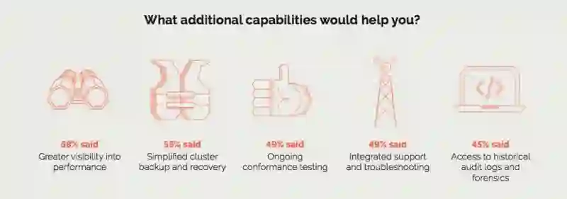 具体来说,开发人员超过 1000 人的团队更希望对集群实时性能有更好的可视性,也更看希望能查看日志审计和检查的历史数据。