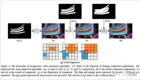 本文通过引入渐进式扩展算法(PSE),可以高效地基于多个尺度的 kernels 重建出文字区域。具体流程如下:
