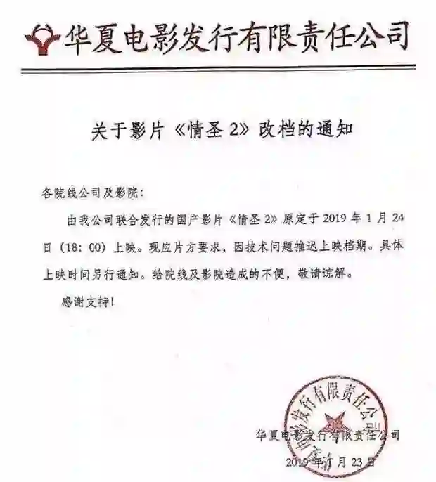 电影发行方华夏电影发行有限责任公司在官方文件中表示,“现应片方要求,因技术问题推迟上映档期。”《情圣2》官方微博发布了撤档海报:感恩同行,来日再见。