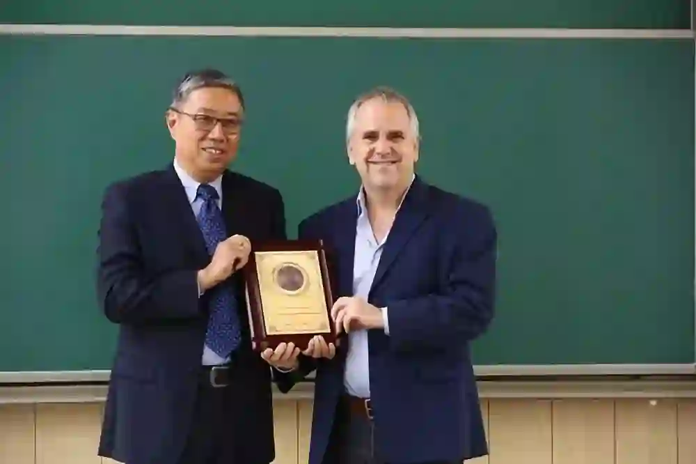 北京大学副校长田刚院士代表学校对Michael I. Jordan教授的加入表示热烈欢迎,并为其颁发了北京大学名誉教授的聘书。学生代表吴凡为Jordan教授佩戴北大校徽。授予仪式由数学科学学院院长陈大岳教授主持。