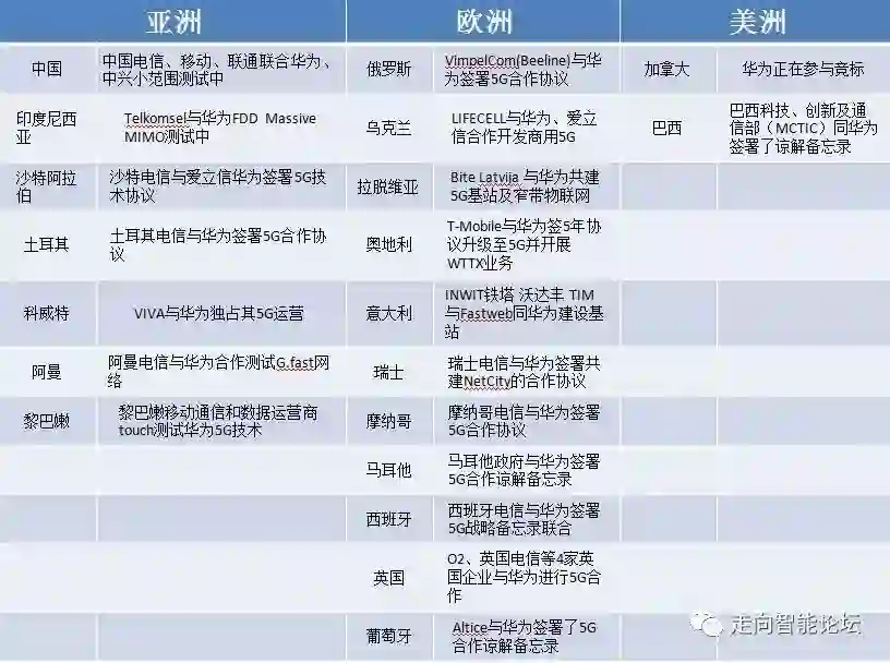目前,全球56个国家布局5G,有20多个国家与华为签约。在亚洲,除了日韩两国不和华为合作,其他的像东南亚国家还是招标中,在中东地区基本上都是采用华为的设备;在欧洲,华为已和很多的国家都签署了合作协议;在美洲,因为美国政府禁止使用华为、中兴设备,因此未进入美国,但巴西已与和华为合作,加拿大对华为也持开放态度。从5G全球布局的国家来看,华为已处于相当优势。华为的竞争对手爱立信和诺基亚主要还是布局在对华为发布禁令的国家。