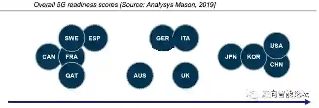 其他国家和地区缺乏5G政策或策略的支持,属于追随状态。世界其他国家正在5G部署方面迎头赶上。英国、德国和意大利国属于“第二梯队”5G开发者,而法国和加拿大则是“第三梯队”,这些国家也陆续开始拍卖频谱带宽,但大多数国家都缺乏正式的5G实施政策和战略,而且大多数国家将在2020年后启动5G服务。