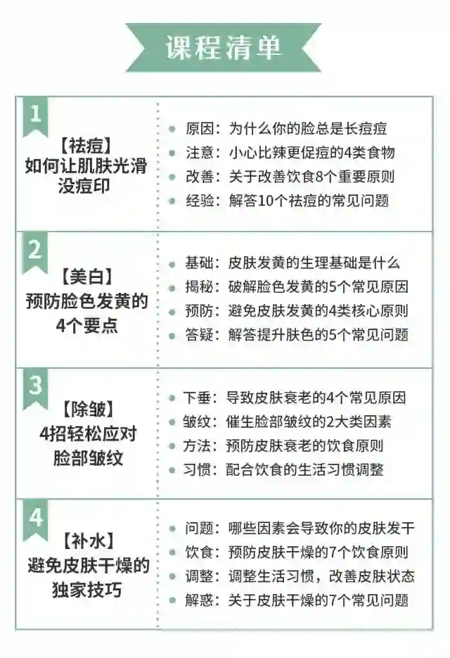 和以往的小讲课有所不同,这次课程总共分为四个部分,它不是简单的复制一套所谓“标准食谱”给你,而是从日常护肤和饮食中看不见的误区着手,帮助你养成科学、系统的饮食保养方法。