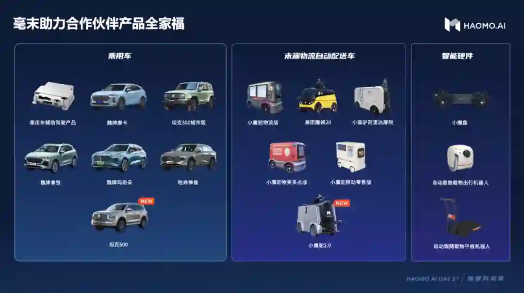 此外,在末端物流方面,毫末也与阿里达摩院、美团、物美多点等达成合作。会上,毫末智行还发布了国内首款10万元级别的末端物流自动配送车产品——毫末小魔驼2.0,单车售价12.88万元,预计在2022年5月陆续投放市场。