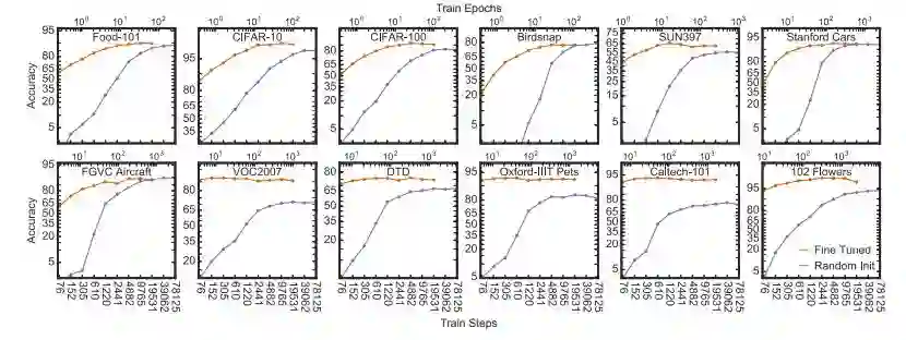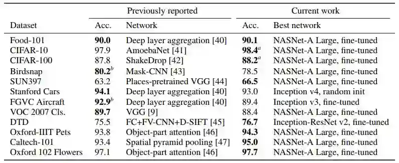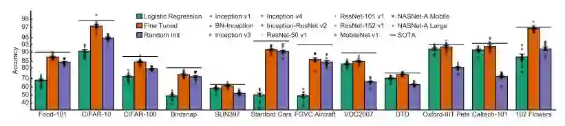 即使权重信息并不能在任务间很好地迁移,但是网络架构可以很好地被迁移。在 3 个小型细粒度分类数据集上,调优并不能为从随机初始化状态开始的训练提供显著的帮助,但是尽管如此,更好的 ImageNet 架构能取得更高的准确率。