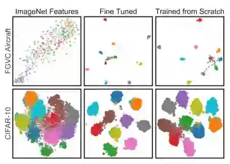 图 1: 细粒度数据集(FGVC 飞机)上的性能可以从调优或从头开始的训练中获得很大的提升,和 ImageNet 类似的数据集(CIFAR-10)上的提升则小一些。低维嵌入在从「inception v4」网络的倒数第二层中的特征上使用 t-SNE[13],用于测试集中的 10 个类别。