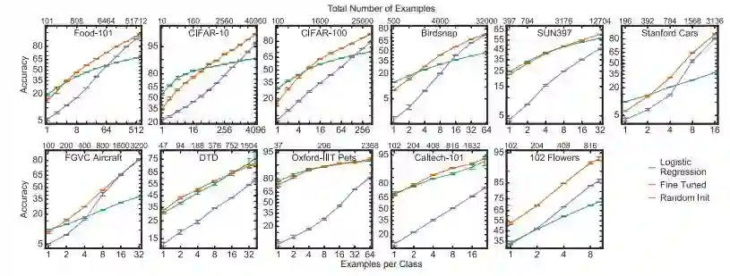 图 3: 对网络进行调优在固定的 ImageNet 特征上或从随机初始化模型开始的训练得到的特征取得了比 logistic 回归更高的准确率。在固定的 ImageNet 特征上的 Logistic 回归和从随机初始化开始训练的网络的性能在很大程度上取决于数据集。图中的坐标经过了合理的放缩。