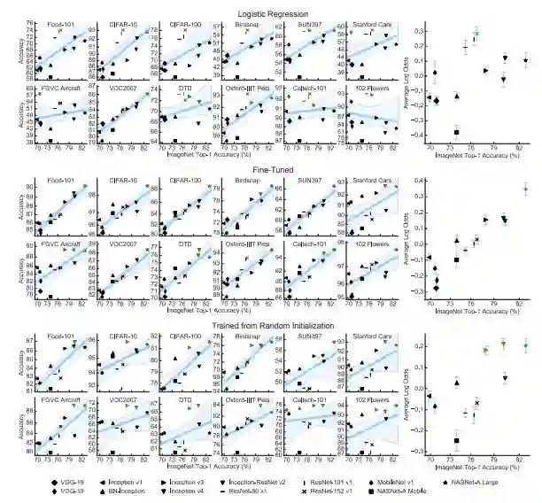 现代计算机视觉研究的一个隐含的假设是,在 ImageNet 上性能更好的模型必定在其它的视觉任务上表现得更好。然而,这个假说从来没有被系统地验证过。谷歌大脑研究者在 3 组实验环境下对比了 13 个分类模型在 12 个图像分类任务上的性能。实验结果表明,ImageNet 架构在其它数据集上的泛化能力很强,在 ImageNet 数据集上的精确率的小小的提升就能够导致在其它数据集上性能的提升,但是 ImageNet 提取出的固定特征的泛化能力小于其架构的泛化能力。
