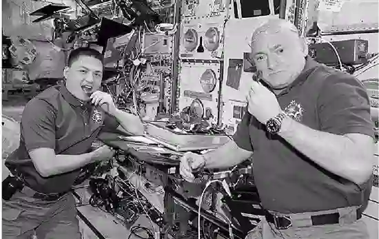 航天员斯科特·凯利(右)和柯吉尔·林格伦在吃自己种的红生菜。