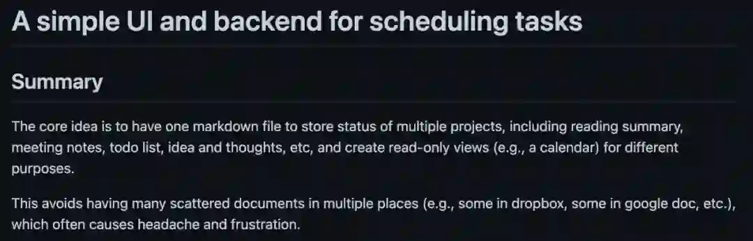 如何快速进行多任务切换,如何不忘记不紧急但重要的事情,如何使用碎片时间进行一些有意义的阅读和思考,是相当重要的。我在下半年抽空写了一个时间管理软件,把待办事项,文章笔记,思路归纳和整理,团队的项目进度都集中放在一个文件里,然后通过一些简单的代码自动解析自定义标签,输出一个综合的日程表。这样可以解决文档散布各处,太多太杂乱的问题。