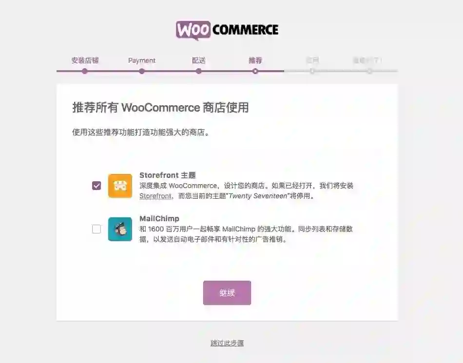 插件安装时,取消 MailChimp 的安装,仅启用 StoreFront: