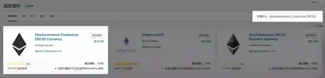 找到 “Woocommerce Customize ERC20 Currency” 插件,并安装。