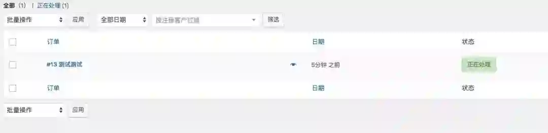 用户支付完成后,如何确定订单已经支付完成了呢?进入后台“仪表盘”-“WooCommerce”-“订单”,可以看到用户所有的订单。