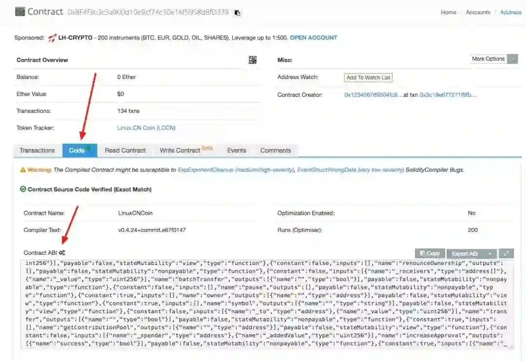 合约 ABI 则可以在 etherscan 中找到,比如,LCCN 的合约地址为:https://etherscan.io/address/0x8f4f3b3c3a900d10e9cf74c30e16f5958d8fd339#code,由于 LCCN 公开了其合约源代码,其 ABI 可以在合约的界面找到(如未公开,请向你的 ERC20 合约开发人员索要 ABI),点击右侧 “Copy”,复制 ABI,并将其填入设置项目中去。