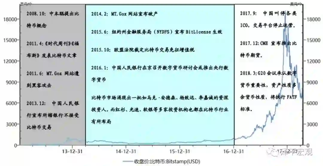 作为一种饱受争议的新型资产,比特币既受国际经济、货币政策、外汇政策等宏观条件的影响,也与交易平台监管、灰色产业刚需、区块链技术发展等因素密切相关。比特币的发展历程,可总结为如下四个阶段。