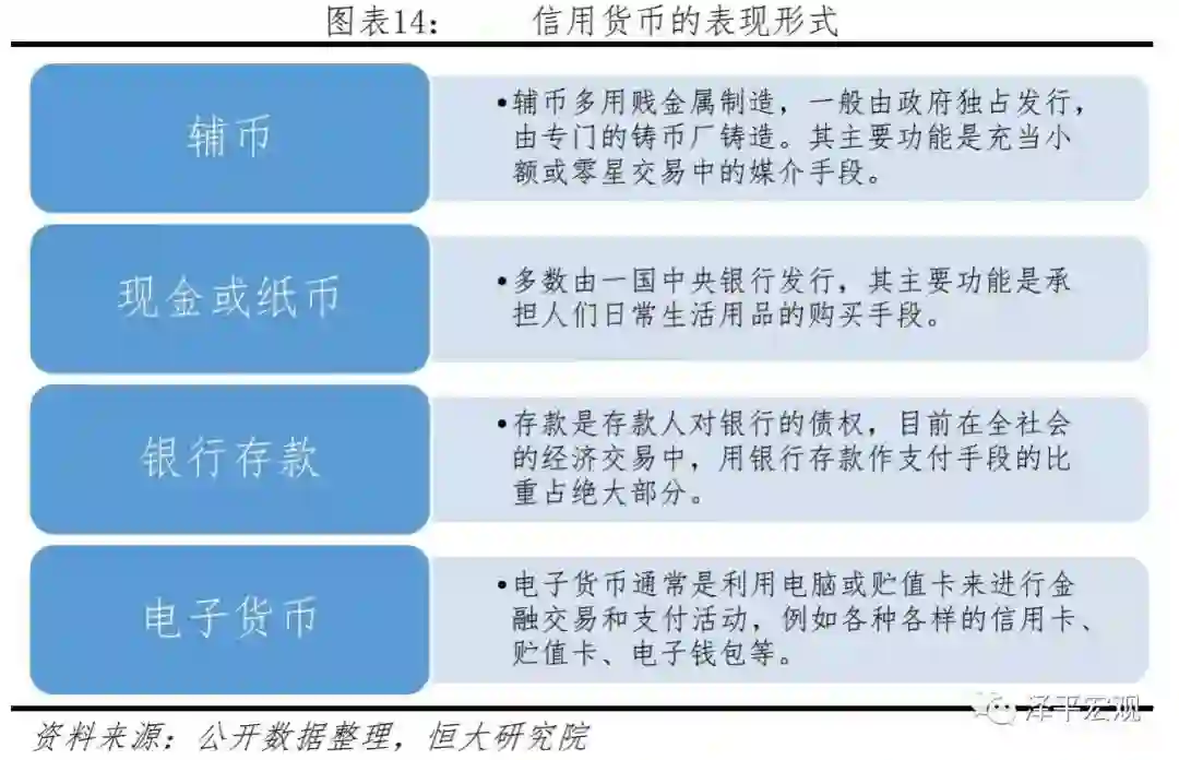 目前世界各国发行的货币,基本都属于信用货币。信用货币的表现形式包括辅币、现金或纸币、银行存款和电子货币。